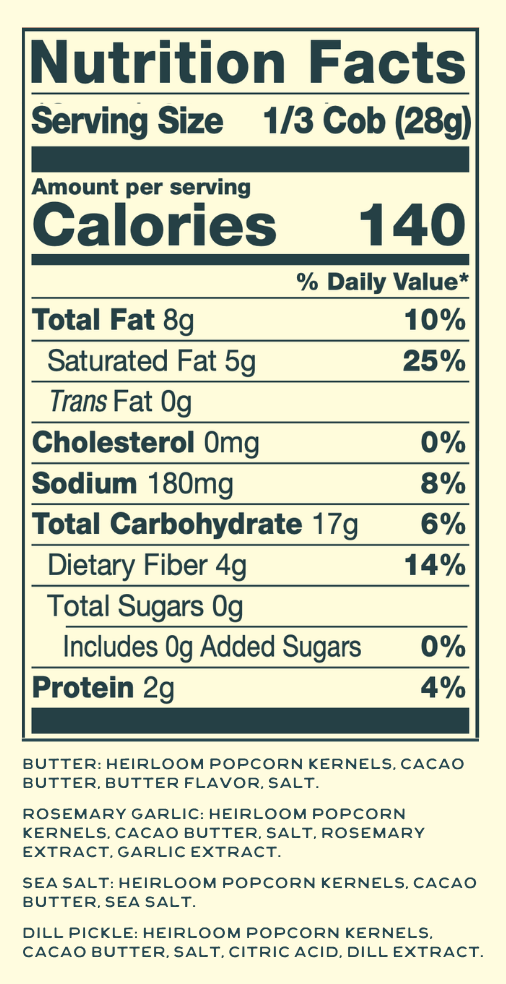 Our popcorn cobs are a bit more expensive to make because of our commitment to high-quality ingredients and manufacturing methods. We only use the best heirloom kernels, cacao butter, and the freshest herbs and spices for our cobs. Sure, you can make the popcorn that comes in a bag, but try our popcorn cobs, and you’ll taste and feel the difference.